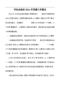 加强组织建设,提升党员素质,深化服务意识,推动创新发展。以下由网友整理分享的“市社会组织20XX年党建工作要点”相关材料,便您学习参考,喜欢就分享给朋友吧!