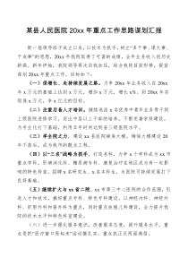 围绕提升医疗服务质量,加强人才队伍建设,推进信息化建设,优化患者就医体验,确保医院稳步发展!以下由网友整理分享的“工作计划某县人民医院20XX年重点工作思路谋划汇报”相关材料,便您学习参考,喜欢就分享给朋友吧!