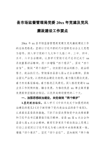 加强政治建设,深化理论学习,强化基层组织,推进作风建设,严格纪律监督,提升服务效能。下面是网友整理分享的县市场监督管理局党委20XX年党建及党风廉政建设工作要点相关资料,供大家学习参考,喜欢就分享吧!