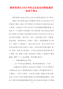 教育局局长围绕四个带头,深入查摆问题,剖析原因,明确整改措施,推动工作提升。下面是网友整理编辑的教育局局长2025年民主生活会对照检查材料四个带头相关范文,供大家参考学习,喜欢就下载支持!