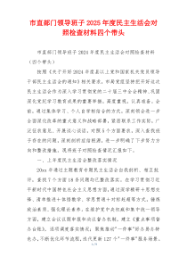 围绕四个带头,市直部门领导班子深入查摆问题,认真剖析原因,明确整改方向,强化责任担当。下面网友分享多篇相关内容供您参考学习,希望有您喜欢的。