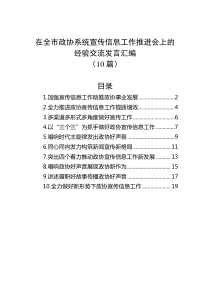 会议强调加强信息收集与报送,提升宣传质量,构建高效沟通平台,促进政协工作创新发展。下面是小编为您整理的10篇在全市政协系统宣传信息工作推进会上的经验交流发言汇编范例,仅供参考,希望对您有所帮助。