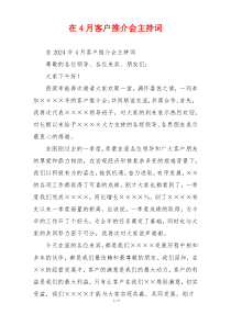 欢迎各位莅临本次客户推介会,共同探讨合作机遇,携手共创美好未来。下面是网友整理分享的在4月客户推介会主持词相关资料,供大家学习参考,喜欢就分享吧!