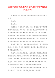 本次会议旨在深入分析全市第四季度安全形势,精准研判风险点,强化措施,确保社会稳定和人民生命财产安全。以下由网友整理分享的在全市第四季度重大安全风险分析研判会上的主持词相关文档,供您学习参考,喜欢就分享吧!