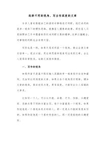 从社会学角度看,现象背后隐藏着深层结构与权力关系;心理学视角则揭示个体行为动因及其对群体影响。以下由网友整理分享的选择不同的视角写出有深度的文章相关文档,供您学习参考,喜欢就分享吧!