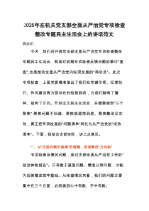 强调深入贯彻从严治党要求,强化政治责任,落实整改措施,提升机关党支部建设水平。下面是小编为您整理的2025年在机关党支部全面从严治党专项检查整改专题民主生活会上的讲话范文范例,仅供参考,希望对您有所帮助。