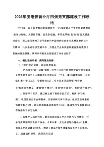 电信营业厅四强党支部建设工作取得显著成效,组织活力增强,党员作用发挥明显,服务水平全面提升。以下由公文包网友为您分享的范文资料,供您参考学习之用。