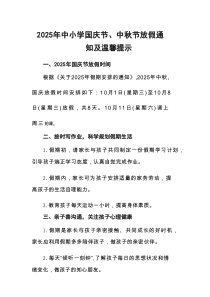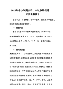 中小学国庆中秋放假通知及安全提示已发布,师生需注意假期安全,具体安排详见学校公告,了解了吗?以下由网友整理分享的2025年中小学国庆节、中秋节放假通知及安全提示合计6份相关文档,供您学习参考,喜欢就分享吧!