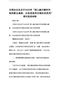 文明办主任强调深入践行党的群众路线,以优良党风引领社风民风,推动社会文明进步。下面是网友整理分享的文明办主任关于2025年“深入践行新时代党的群众路线、以优良党风引领社风民风”研讨发言材料相关资料,供大家学习参考,喜欢就分享吧!